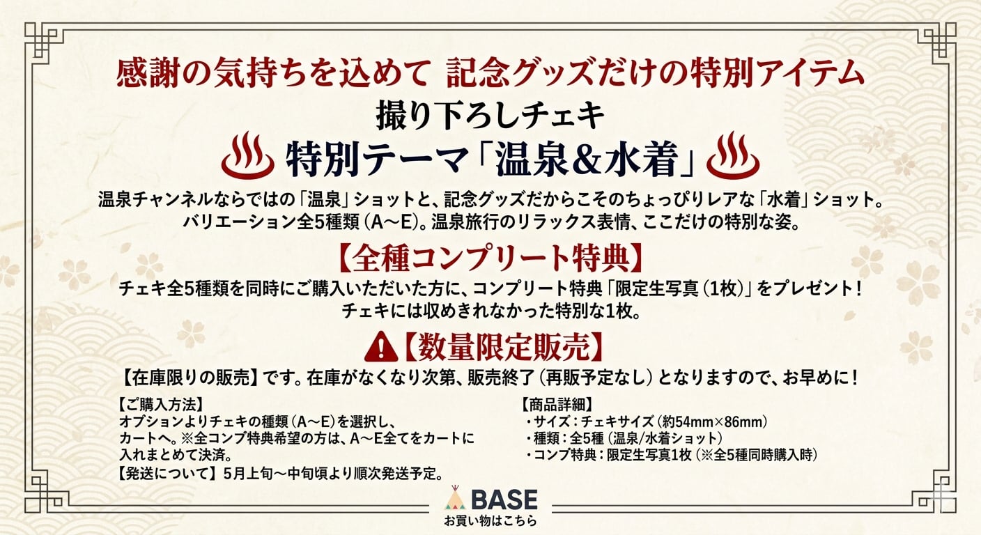 今回は、温泉チャンネルならではの「温泉」ショットと、記念グッズだからこそのちょっぴりレアな「水着」ショットのチェキをご用意しました!